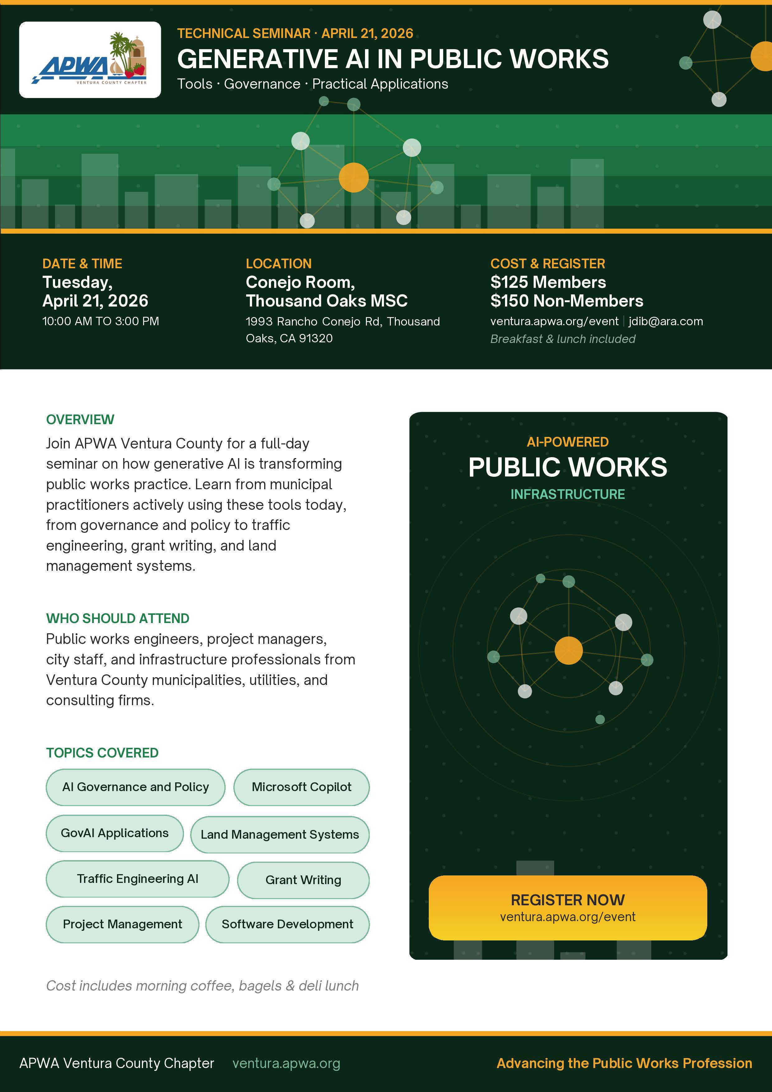 Join APWA Ventura County for a full-day seminar on how generative AI is transforming public works practice. Learn from municipal practitioners actively using these tools today, covering topics from AI governance and policy to traffic engineering, grant writing, and land management systems. This seminar is designed for public works engineers, project managers, city staff, and infrastructure professionals from Ventura County municipalities, utilities, and consulting firms. Cost includes morning coffee, bagels, and deli lunch.