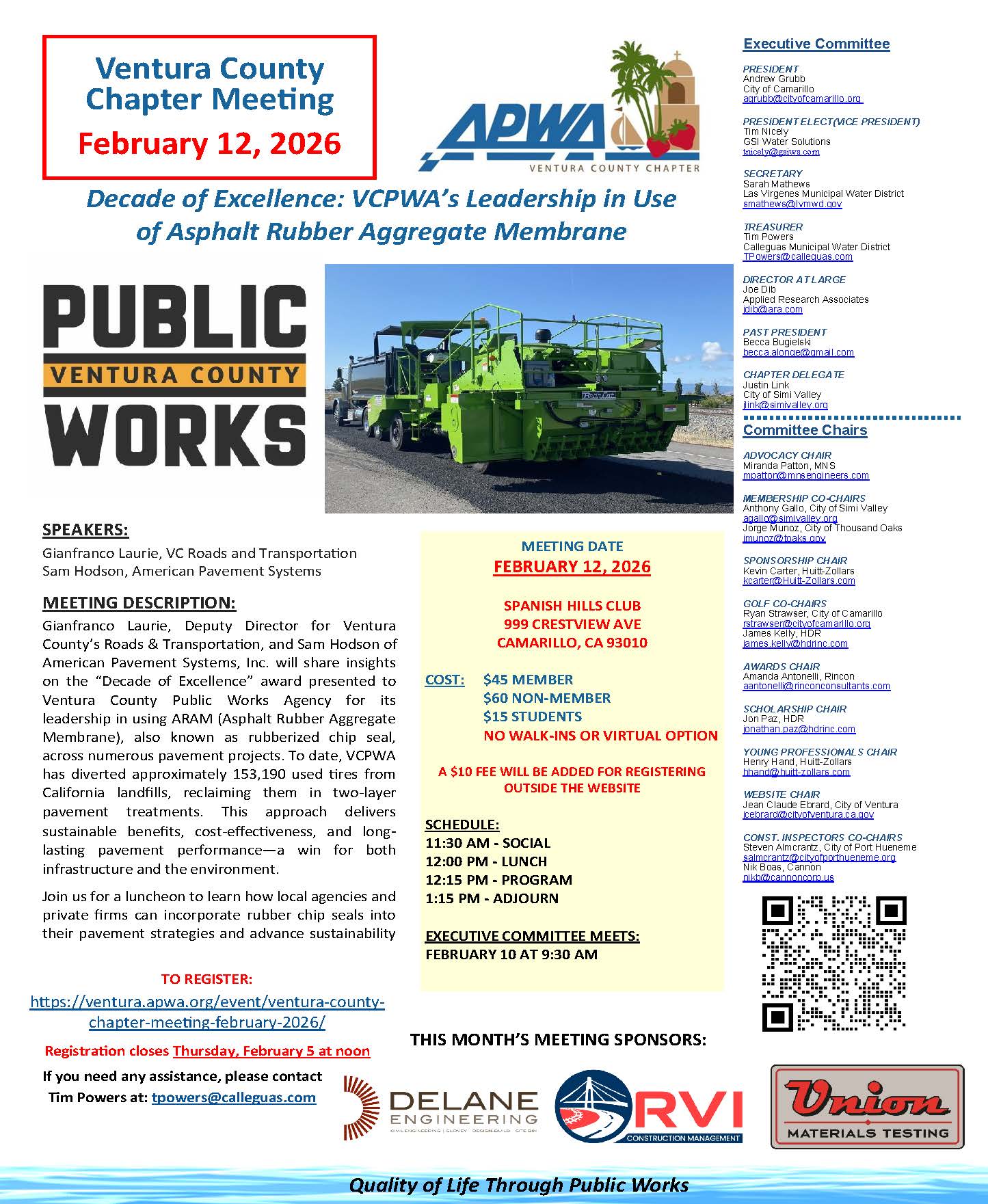 Register Now Event Type Chapter Events Venue Spanish Hills Club999 Crestview AvenueCamarillo, CAUnited States Related Events February 4, 2026 SC/RC Perspective On Fleet Management Register Today February 19, 2026 APWA RaInDROPs Keep Falling on My Head: Embodyi... Register Today March 19, 2026 APWA Transforming the Future of Solid Waste thr... Register Today